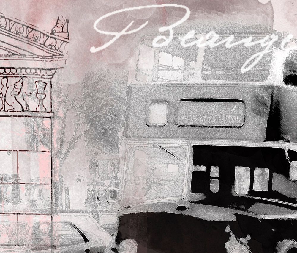 Nostalgic mixed media art featuring historic bus in London, illustration in subtle dusty pink and grey colors