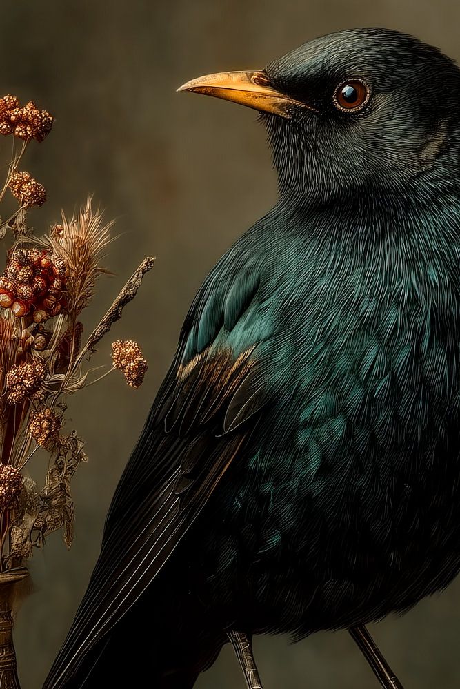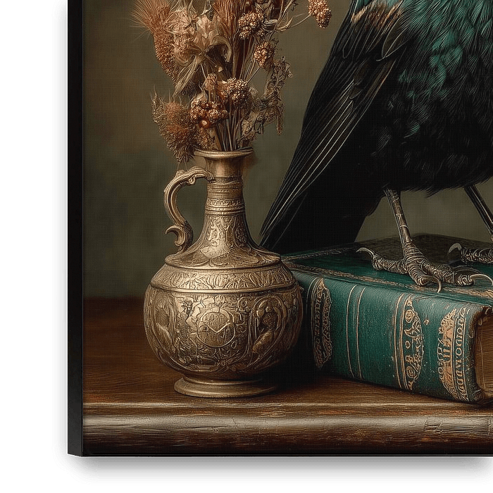 Bring timeless elegance into your home with this sophisticated artwork featuring a majestic-looking blackbird. The painting combines classic still-life elements with an almost regal presence of the bird, posing proudly on an antique book. The deep, iridescent hues of its feathers contrast beautifully with the warm, earthy colours of…