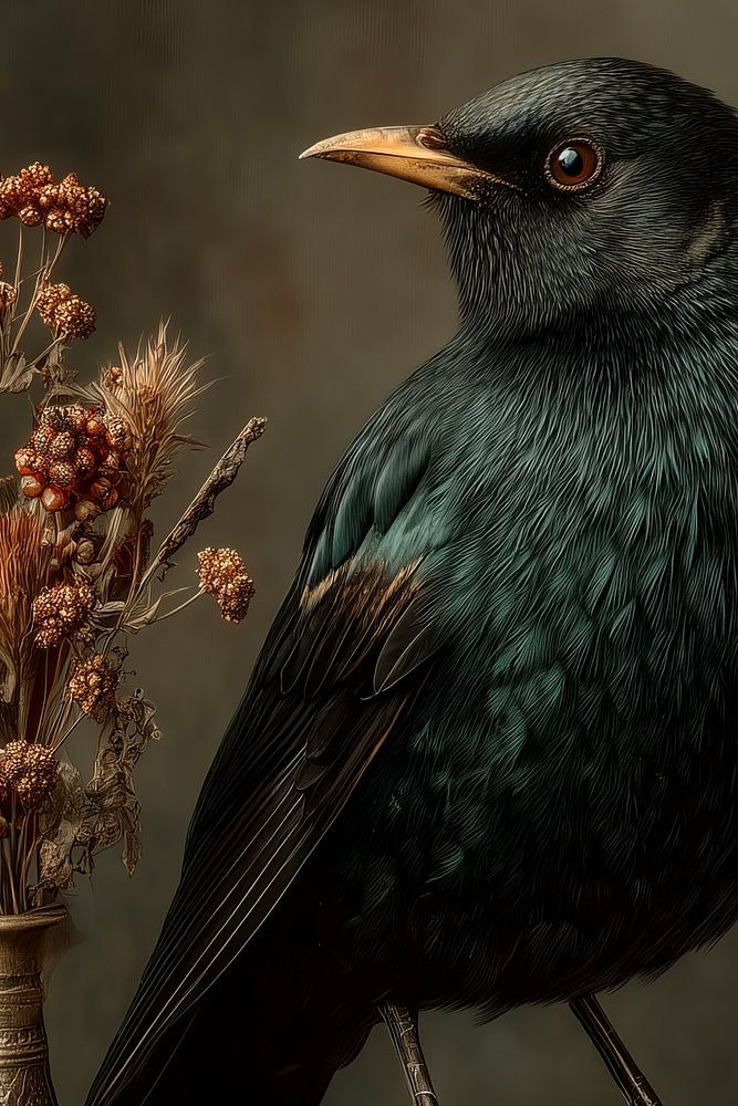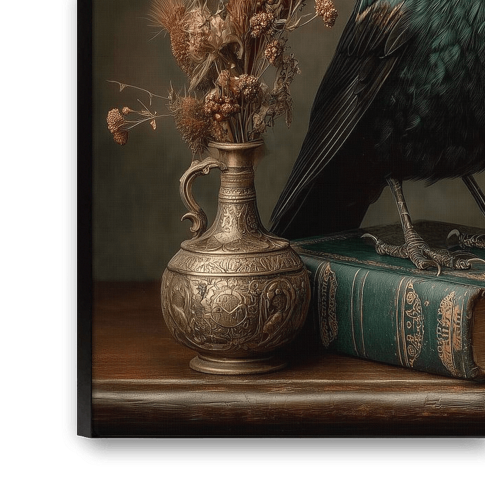 Bring timeless elegance into your home with this sophisticated artwork featuring a majestic-looking blackbird. The painting combines classic still-life elements with an almost regal presence of the bird, posing proudly on an antique book. The deep, iridescent hues of its feathers contrast beautifully with the warm, earthy colours of…