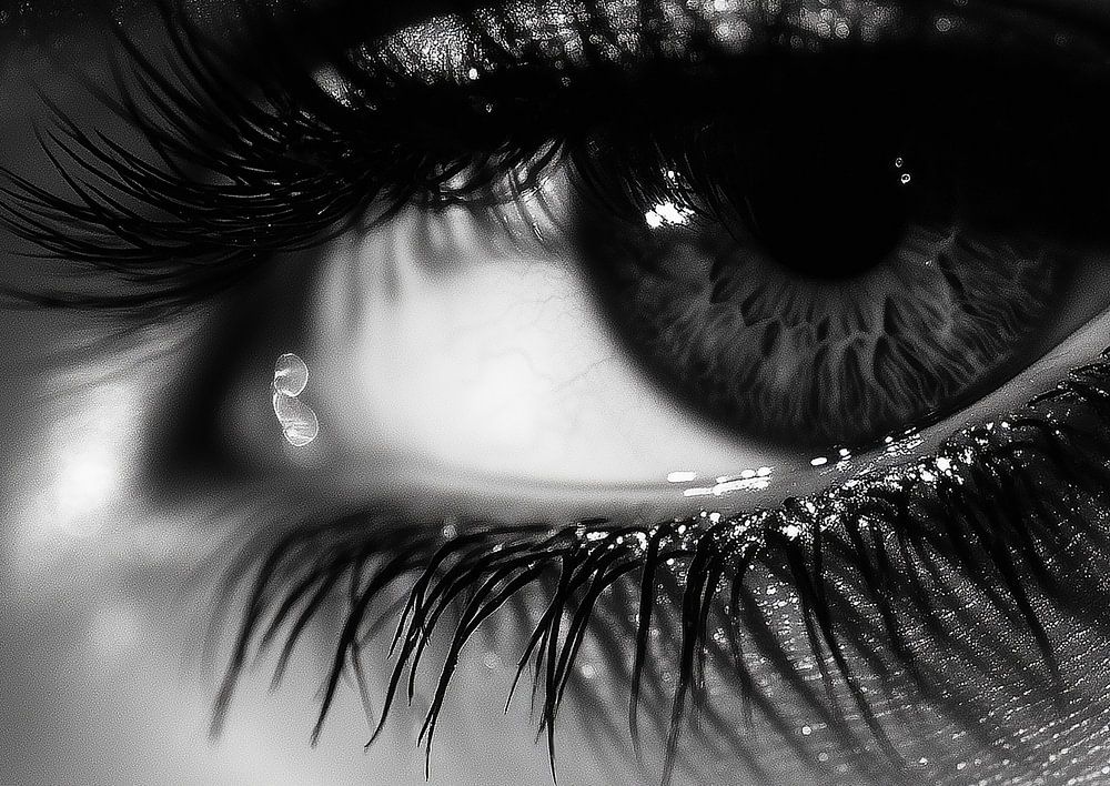 Vintage Noir-style, a moody, high-contrast black-and-white close-up of an eye. A few pearls rest gracefully on the face, like tiny light catchers in the darkness. The image's grainy texture and dramatic shadows instantly evoke the timeless elegance of old Hollywood photography. Every line, shine and shadow contributes to an atmosphere of mystery and sophistication. The image exudes a cinematic allure, like a still moment from a forgotten black-and-white film, intense, seductive and elusive, as if the eye is keeping a secret that will never be fully revealed.