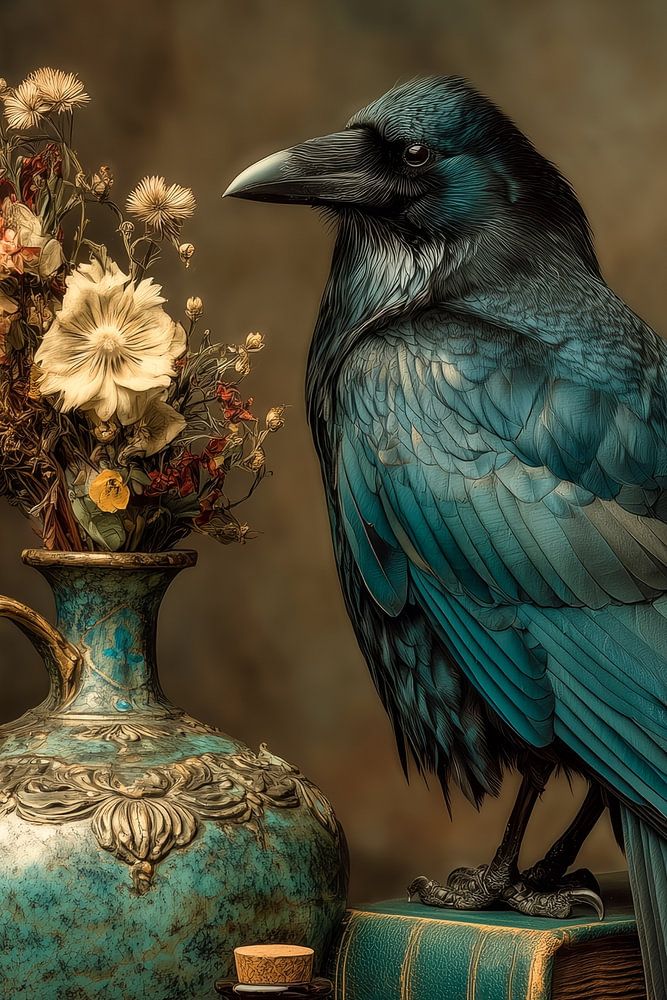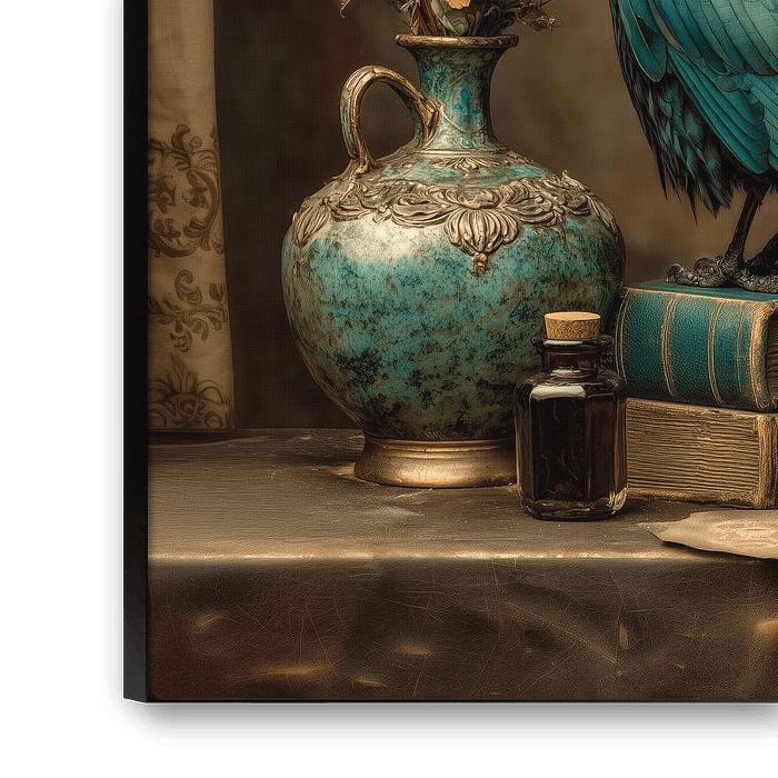 Bring a touch of mystery and sophistication to your interiors with this enchanting artwork. This painting shows a stately raven posing proudly on a stack of old books, surrounded by timeless objects such as an antique turquoise vase with dried flowers and a classic ink bottle. The rich, warm tones and subtle lighting give the scene an…