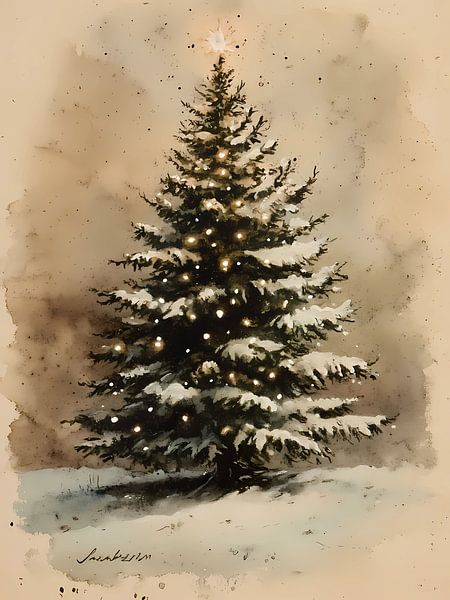 A softly lit Christmas tree glows warmly against a serene snowy backdrop.