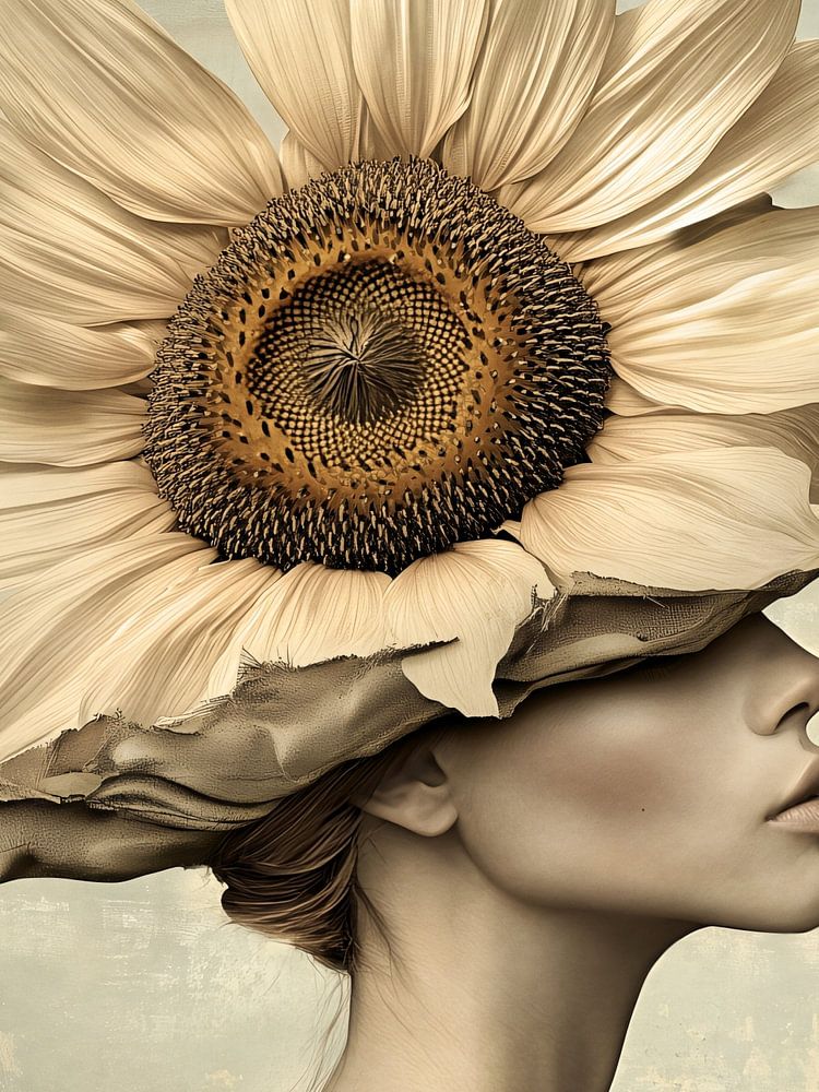 Vintage profile portrait of a woman with a large sunflower on her head in soft natural tones.