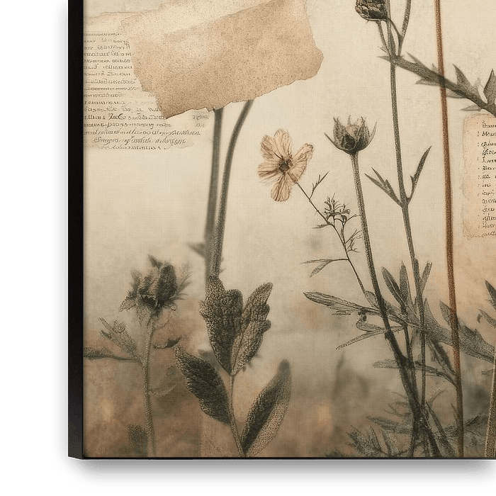 Vintage collage with dried flowers and faded texts. A special eye-catcher for your interior! In the New Country style. Choose your own size and material for this work.