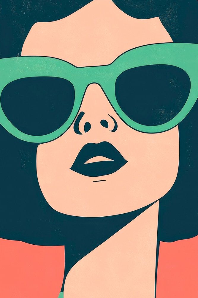 Elegance and retro charm radiate from this mysterious lady, whose bold sunglasses and curly hairstyle immediately catch the eye. Her graceful pose and the warm, delicate background create a captivating aura. Perfect for the living room, this artwork adds a touch of style and personality to any room.