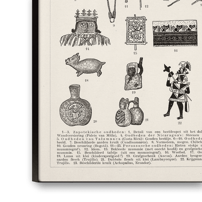 Old image from c. 1905 depicting ancient ethnographic objects from early American peoples. We see objects from places such as present-day Nicaragua, Costa Rica, Peru and Ecuador.