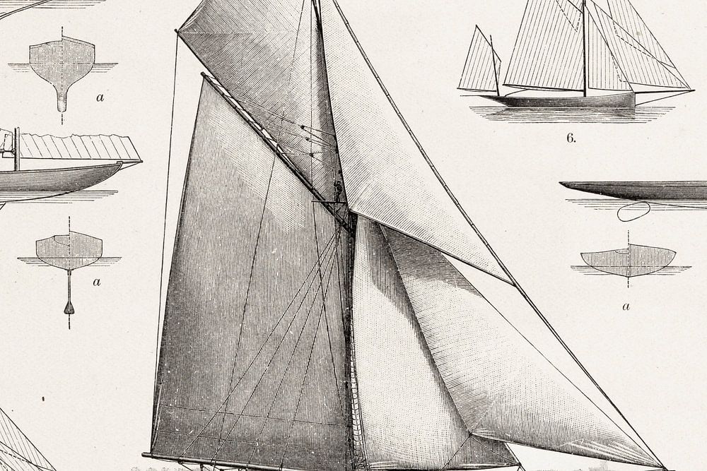 This antique engraving from around 1900 shows a number of types of sailing yachts. These include keel yacht, sword yacht, sloop, schooner and jol.