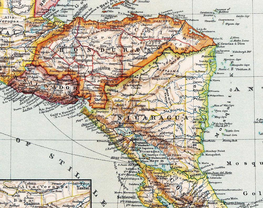 This antique map from around 1900 shows the states of Panama, Guatemala, Honduras, San Salvador, Nicaragua and Costa Rica. The map is in colour.