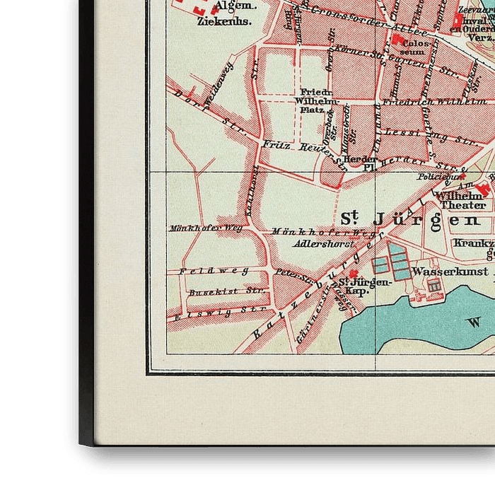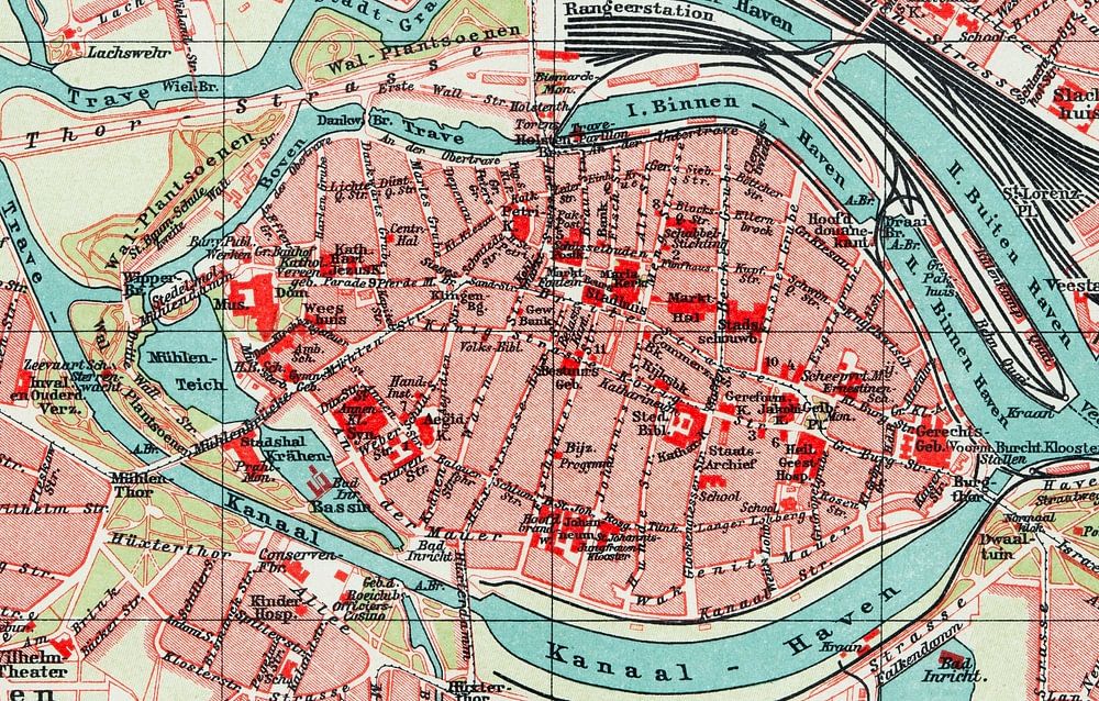 This antique map from around 1900 shows a map of the German city of Lübeck. This city map is in colour.