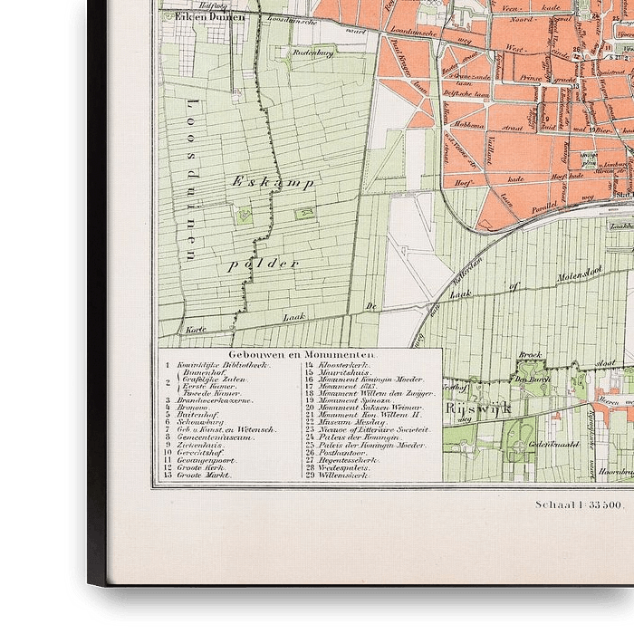 Antique map from c. 1900 of The Hague ('s Gravenhage) and Scheveningen. The map is in colour. A list of buildings and monuments is included.