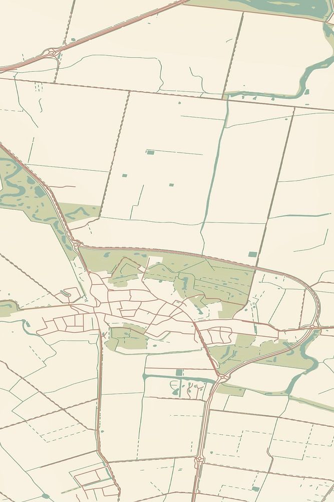 Retro map of Aardenburg, located in the municipality of Sluis, province of Zeeland. The map shows public roads, waterways (lakes, streams and ditches) and forests in and around Aardenburg. In addition, the map contains the coordinates of Aardenburg.