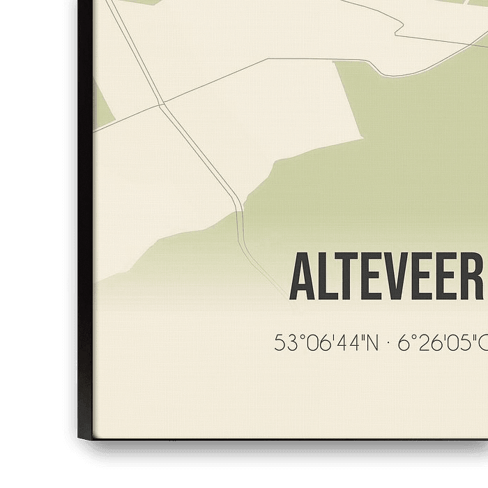 Retro map of Alteveer, located in the municipality of Noordenveld, province of Drenthe. The map shows public roads, waterways (lakes, streams and ditches) and forests in and around Alteveer. In addition, the map contains the coordinates of Alteveer.