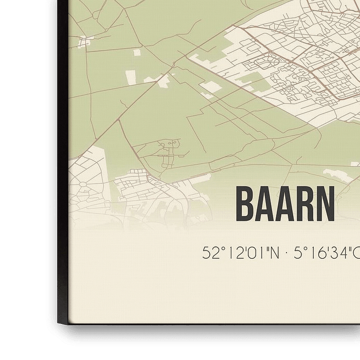 Retro map of Baarn, located in the Gooi region, in the municipality of Baarn, province of Utrecht. The map shows public roads, watercourses (lakes, streams and ditches) and forests in and around Baarn. In addition, the map contains the coordinates of Baarn.