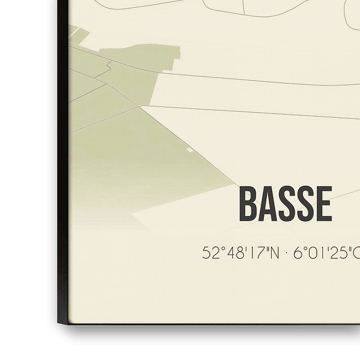 Retro map of Basse, located in the municipality of Steenwijkerland, province of Overijssel. The map shows public roads, watercourses (lakes, streams and ditches) and forests in and around Basse. In addition, the map contains the coordinates of Basse.