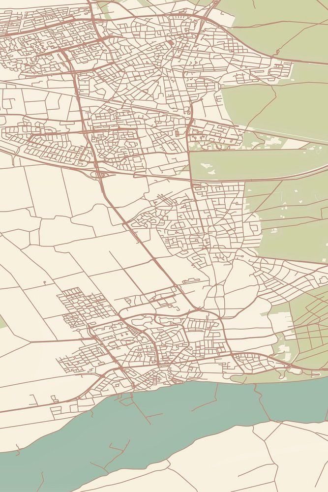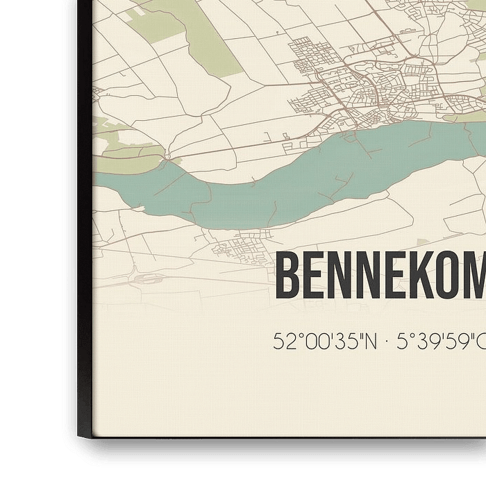 Retro map of Bennekom, located on the Veluwe, in the municipality of Ede, province of Gelderland. The map shows public roads, waterways (lakes, streams and ditches) and forests in and around Bennekom. In addition, the map contains the coordinates of Bennekom.