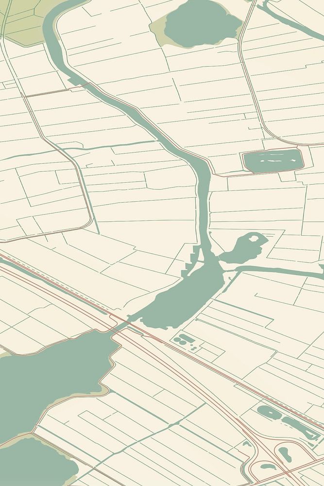 Retro map of Broek, located in the municipality of De Fryske Marren, province of Fryslan. The map shows public roads, watercourses (lakes, streams and ditches) and forests in and around Broek. In addition, the map contains the coordinates of Broek.