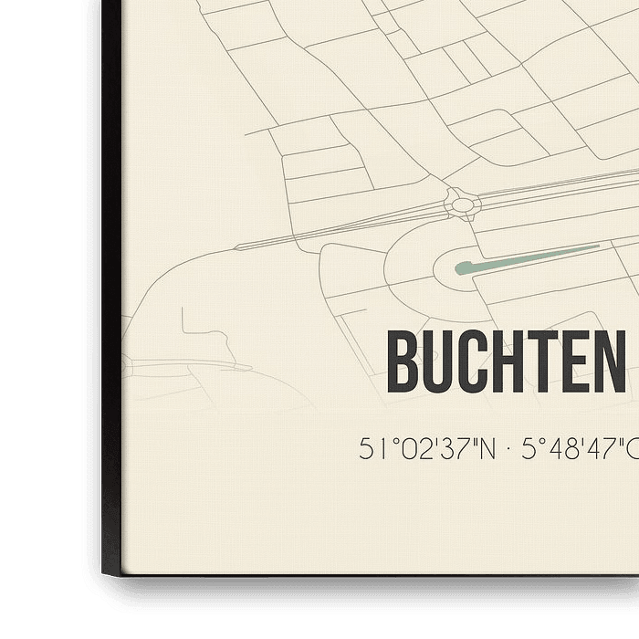 Retro map of Buchten, located in the municipality of Sittard-Geleen, province of Limburg. The map shows public roads, watercourses (lakes, streams and ditches) and forests in and around Buchten. In addition, the map contains the coordinates of Buchten.