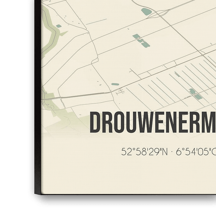 Retro map of Drouwenermond, located in the municipality of Borger-Odoorn, province of Drenthe. The map shows public roads, watercourses (lakes, streams and ditches) and forests in and around Drouwenermond. In addition, the map contains the coordinates of Drouwenermond.