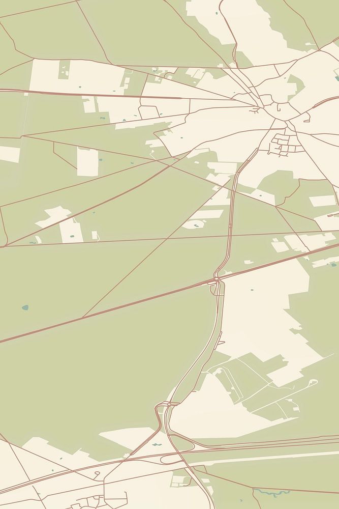 Retro map of Garderen, located in the Veluwe, in the municipality of Barneveld, province of Gelderland. The map shows public roads, waterways (lakes, streams and ditches) and forests in and around Garderen. In addition, the map contains the coordinates of Garderen.