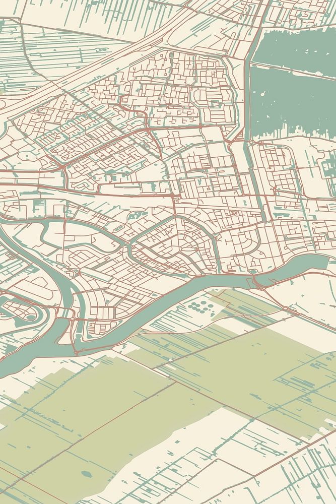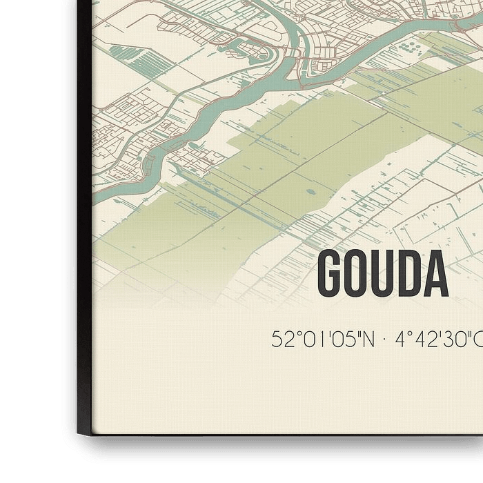 Retro map of Gouda, located in the municipality of Gouda, province of South Holland. The map shows public roads, watercourses (lakes, streams and ditches) and forests in and around Gouda. Furthermore, the map contains the coordinates of Gouda.
