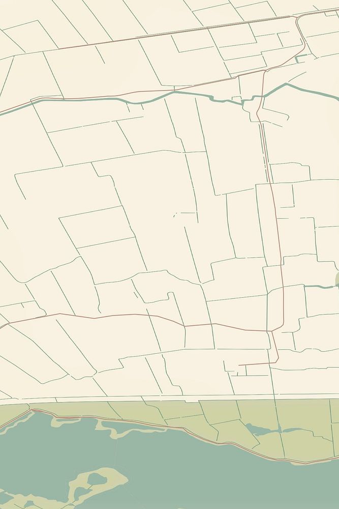 Retro map of Greonterp, located in the municipality of Sudwest-Fryslan, province of Fryslan. The map shows public roads, watercourses (lakes, streams and ditches) and forests in and around Greonterp. In addition, the map contains the coordinates of Greonterp.