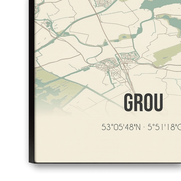 Retro map of Grou, located in the municipality of Leeuwarden, province of Fryslan. The map shows public roads, watercourses (lakes, streams and ditches) and forests in and around Grou. In addition, the map contains the coordinates of Grou.