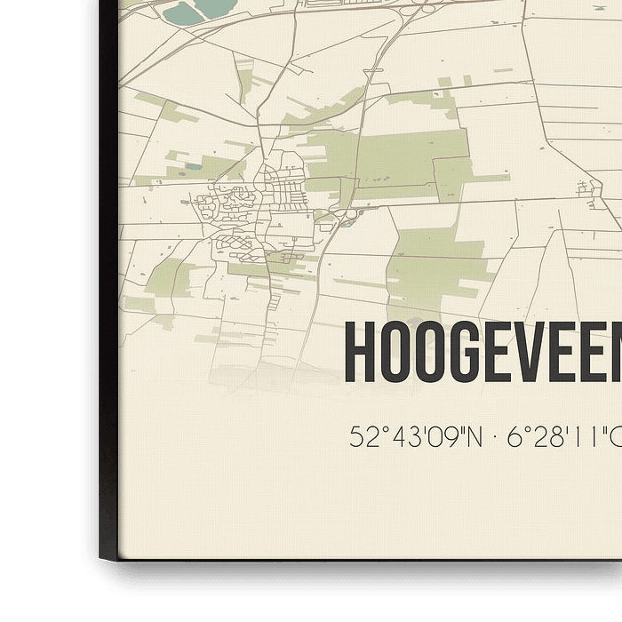 Retro map of Hoogeveen, located in the municipality of Hoogeveen, province of Drenthe. The map shows public roads, waterways (lakes, streams and ditches) and forests in and around Hoogeveen. In addition, the map shows the coordinates of Hoogeveen.