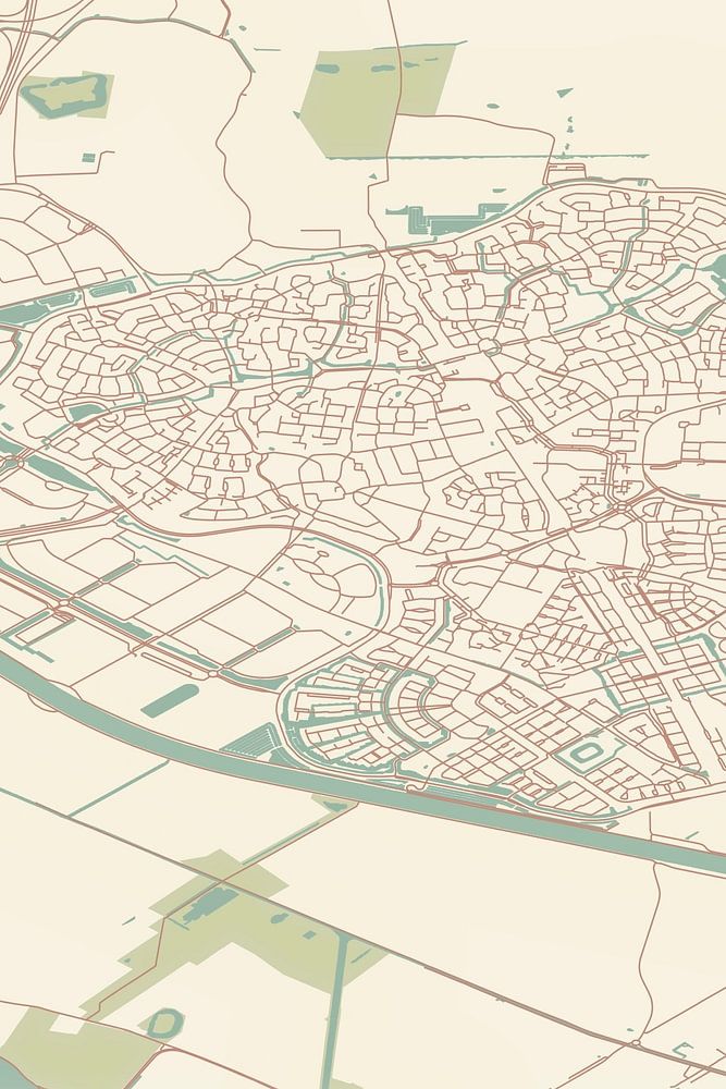 Retro map of Houten, located in the municipality of Houten, Utrecht province. The map shows public roads, watercourses (lakes, streams and ditches) and forests in and around Houten. Furthermore, the map contains the coordinates of Houten.