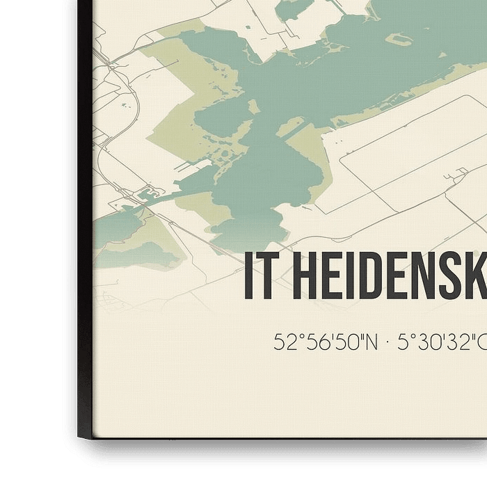 Retro map of It Heidenskip, located in the municipality of Sudwest-Fryslan, province of Fryslan. The map shows public roads, watercourses (lakes, streams and ditches) and forests in and around It Heidenskip. In addition, the map contains the coordinates of It Heidenskip.