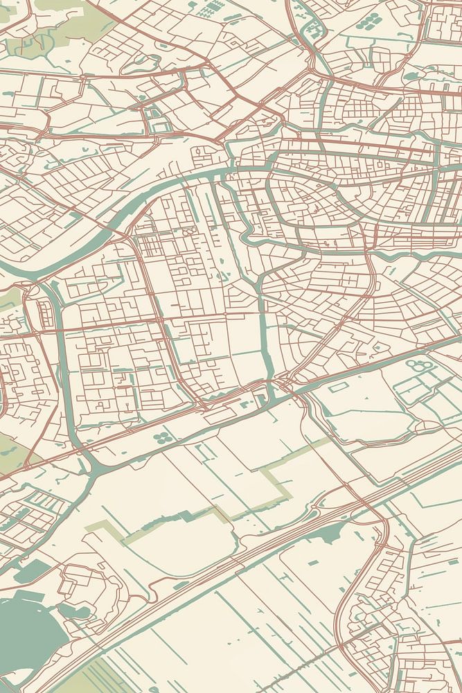 Retro map of Leiden, located in the municipality of Leiden, province of South Holland. The map shows public roads, watercourses (lakes, streams and ditches) and forests in and around Leiden. In addition, the map features the coordinates of Leiden.