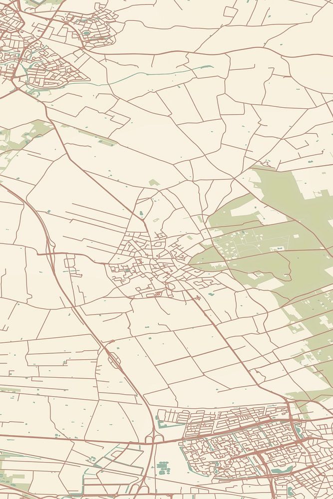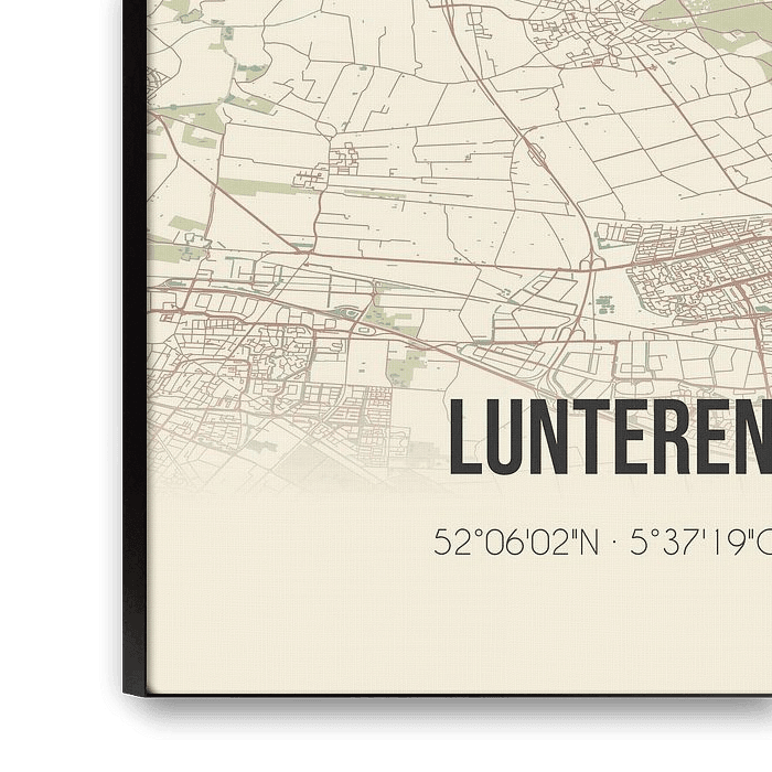 Retro map of Lunteren, located in the Veluwe, in the municipality of Ede, province of Gelderland. The map shows public roads, watercourses (lakes, streams and ditches) and forests in and around Lunteren. In addition, the map contains the coordinates of Lunteren.