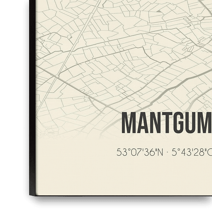 Retro map of Mantgum, located in the municipality of Leeuwarden, province of Fryslan. The map shows public roads, watercourses (lakes, streams and ditches) and forests in and around Mantgum. In addition, the map contains the coordinates of Mantgum.