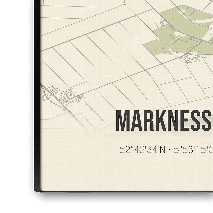 Retro map of Marknesse, located in the municipality of Noordoostpolder, province of Flevoland. The map shows public roads, watercourses (lakes, streams and ditches) and forests in and around Marknesse. In addition, the map contains the coordinates of Marknesse.