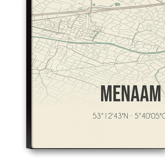 Retro map of Menaam, located in the municipality of Waadhoeke, province of Fryslan. The map shows public roads, watercourses (lakes, streams and ditches) and forests in and around Menaam. In addition, the map contains the coordinates of Menaam.