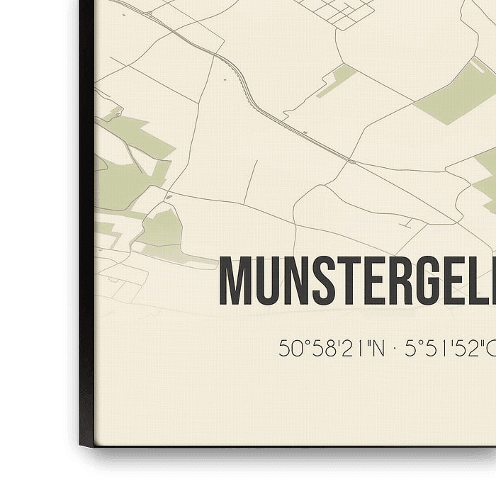Retro map of Munstergeleen, located in the municipality of Sittard-Geleen, province of Limburg. The map shows public roads, watercourses (lakes, streams and ditches) and forests in and around Munstergeleen. In addition, the map contains the coordinates of Munstergeleen.