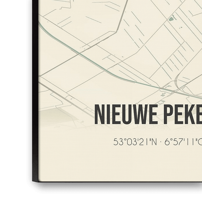Retro map of Nieuwe Pekela, located in the municipality of Pekela, province of Groningen. The map shows public roads, watercourses (lakes, streams and ditches) and forests in and around Nieuwe Pekela. In addition, the map contains the coordinates of Nieuwe Pekela.
