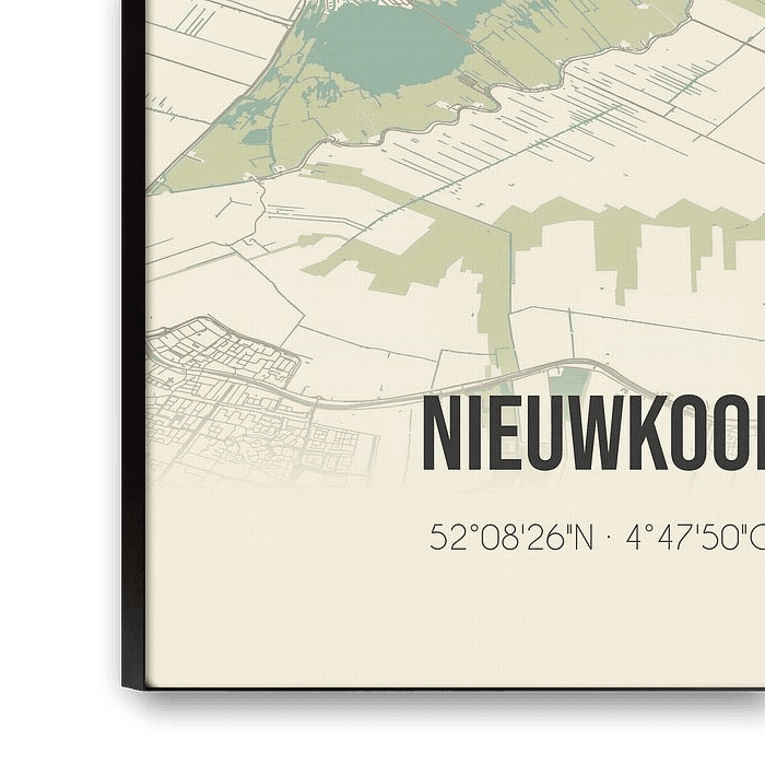 Retro map of Nieuwkoop, located in the municipality of Nieuwkoop, province of South Holland. The map shows public roads, watercourses (lakes, streams and ditches) and forests in and around Nieuwkoop. Furthermore, the map contains the coordinates of Nieuwkoop.