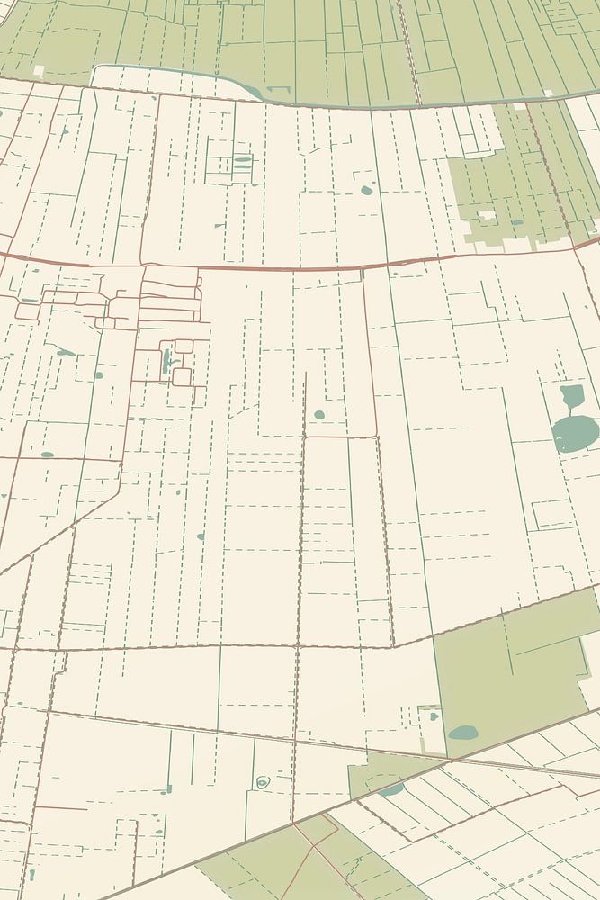 Retro map of Opende, located in the municipality of Westerkwartier, province of Groningen. The map shows public roads, waterways (lakes, streams and ditches) and forests in and around Opende. In addition, the map contains the coordinates of Opende.