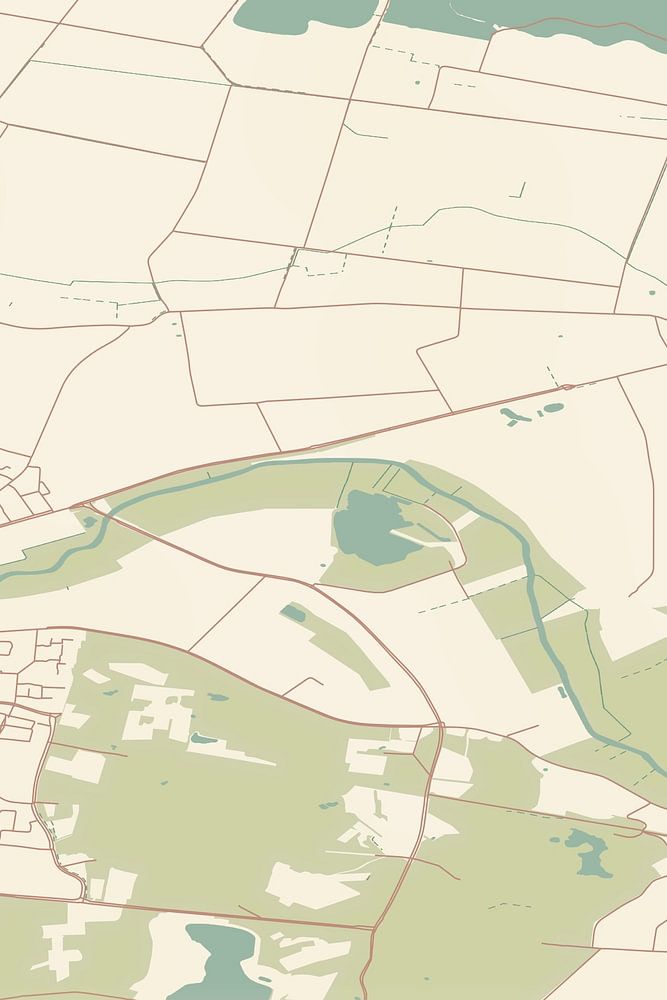 Retro map of Ottersum, located in the municipality of Gennep, province of Limburg. The map shows public roads, waterways (lakes, streams and ditches) and forests in and around Ottersum. In addition, the map contains the coordinates of Ottersum.