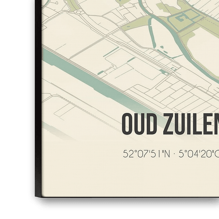 Retro map of Oud Zuilen, located in the municipality of StichtseVecht, province of Utrecht. The map shows public roads, waterways (lakes, streams and ditches) and forests in and around Oud Zuilen. Furthermore, the map is provided with the coordinates of Oud Zuilen.