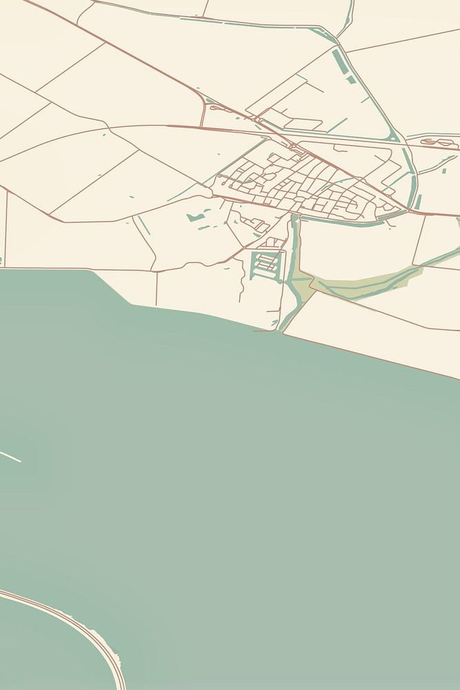 Retro map of Oude-Tonge, located in the municipality of Goeree-Overflakkee, province of South Holland. The map shows public roads, watercourses (lakes, streams and ditches) and forests in and around Oude-Tonge. In addition, the map contains the coordinates of Oude-Tonge.
