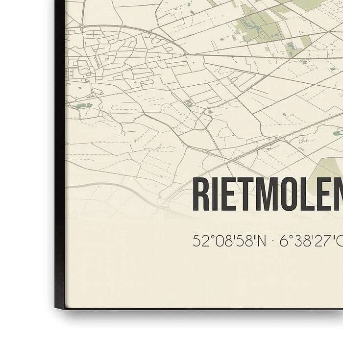 Retro map of Rietmolen, located in the Achterhoek region, in the municipality of Berkelland, Gelderland province. The map shows public roads, watercourses (lakes, streams and ditches) and forests in and around Rietmolen. In addition, the map contains the coordinates of Rietmolen.