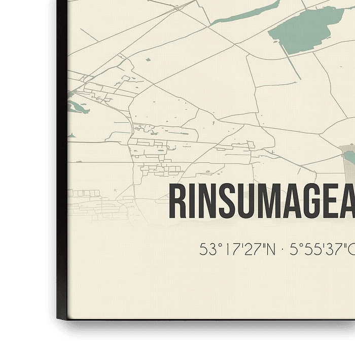 Retro map of Rinsumageast, located in the municipality of Dantumadiel, province of Fryslan. The map shows public roads, watercourses (lakes, streams and ditches) and forests in and around Rinsumageast. In addition, the map contains the coordinates of Rinsumageast.