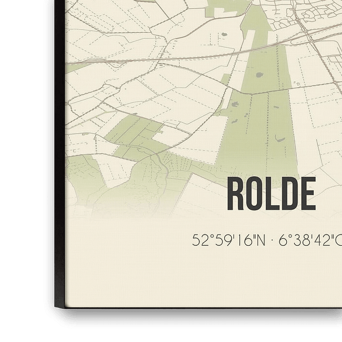 Retro map of Rolde, located in the municipality of Aa and Hunze, province of Drenthe. The map shows public roads, watercourses (lakes, streams and ditches) and forests in and around Rolde. In addition, the map contains the coordinates of Rolde.