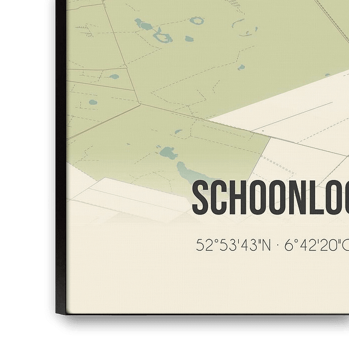 Retro map of Schoonloo, located in the municipality of Aa en Hunze, province of Drenthe. The map shows public roads, watercourses (lakes, streams and ditches) and forests in and around Schoonloo. In addition, the map contains the coordinates of Schoonloo.