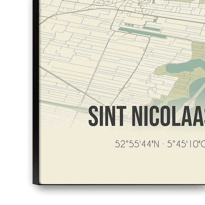 Retro map of Sint Nicolaasga, located in the municipality of De Fryske Marren, province of Fryslan. The map shows public roads, waterways (lakes, streams and ditches) and forests in and around Sint Nicolaasga. In addition, the map contains the coordinates of Sint Nicolaasga.