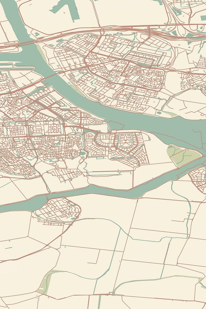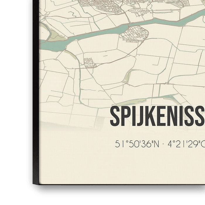 Retro map of Spijkenisse, located in the municipality of Nissewaard, province of South Holland. The map shows public roads, watercourses (lakes, streams and ditches) and forests in and around Spijkenisse. In addition, the map contains the coordinates of Spijkenisse.