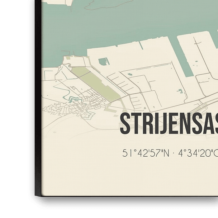 Retro map of Strijensas, located in the municipality of Hoeksche Waard, province of South Holland. The map shows public roads, watercourses (lakes, streams and ditches) and forests in and around Strijensas. In addition, the map contains the coordinates of Strijensas.