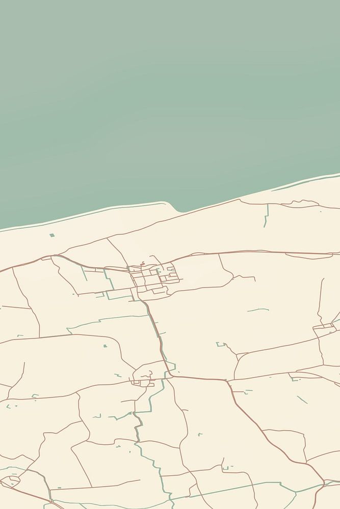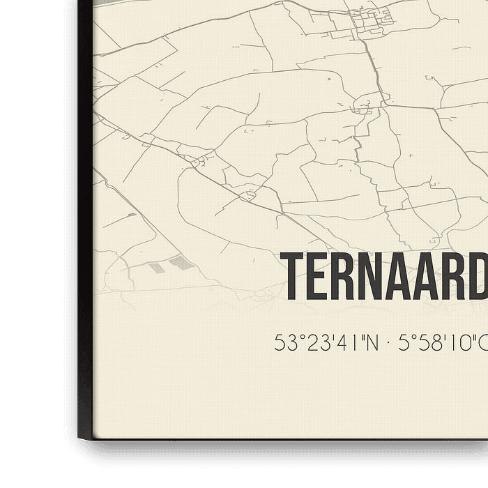Retro map of Ternaard, located in the municipality of Noardeast-Fryslan, province of Fryslan. The map shows public roads, waterways (lakes, streams and ditches) and forests in and around Ternaard. In addition, the map contains the coordinates of Ternaard.