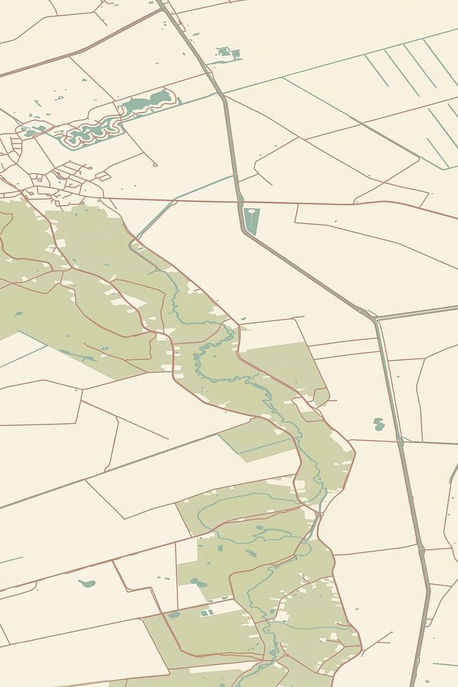 Retro map of Vlagtwedde, located in the municipality of Westerwolde, province of Groningen. The map shows public roads, watercourses (lakes, streams and ditches) and forests in and around Vlagtwedde. In addition, the map contains the coordinates of Vlagtwedde.